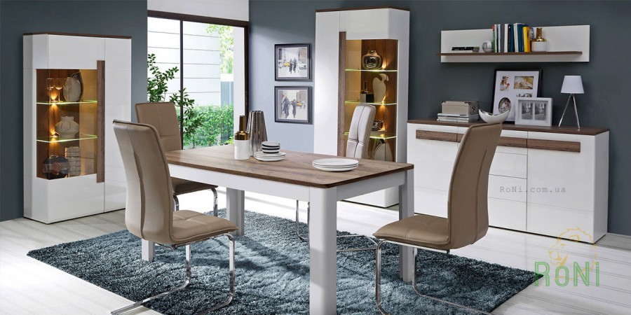 Гостиная Recent (Рецент Форте) современная мебель от производителя Forte понравится всем, кто выбирает яркую мебель внутри своей квартиры. Приложенная белая игра на фасадах с вставкой из дуба tabac будет инновационным решением как в гостиной, так и в столовой.