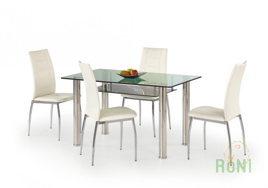 Стол LENART HALMAR - обеденный стол польской компании Halmar (Халмар) со стеклянной прямоугольной столешницей и четырьмя металлическими ножками. материал: столешница и полка - стекло закаленное; каркас - сталь нержавеющая. цвет: столешница - прозрачный с зеленым оттенком полка - черный с узором; металл - хром.
