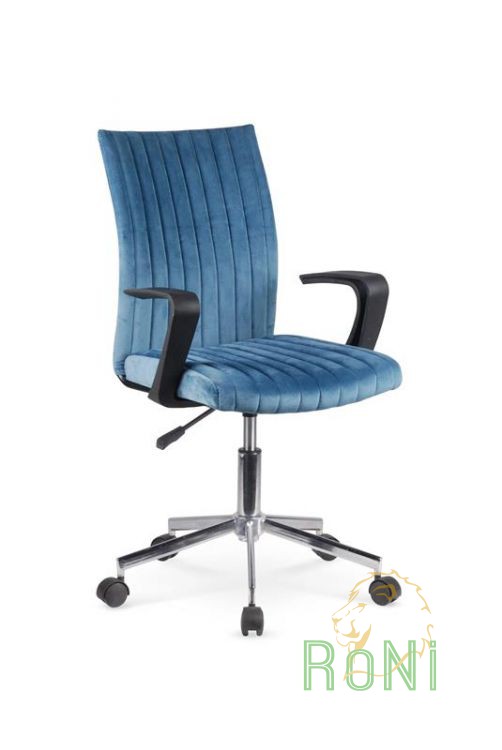 Поворотный стул DORAL обитый синей тканью. Кроме того, он является универсальным цветом. Ткань, из которой изготовлен стул, более устойчивой к механическим повреждениям. Основной механизм позволит вам установить соответствующую высоту сиденья для роста ребенка, а дополнительно профилированная спинка и пластиковые подлокотники сделают так, что даже дольше сидения за партой не будет отягощать детское тело. Кресло DORAL включая колеса, предназначенные для ковров