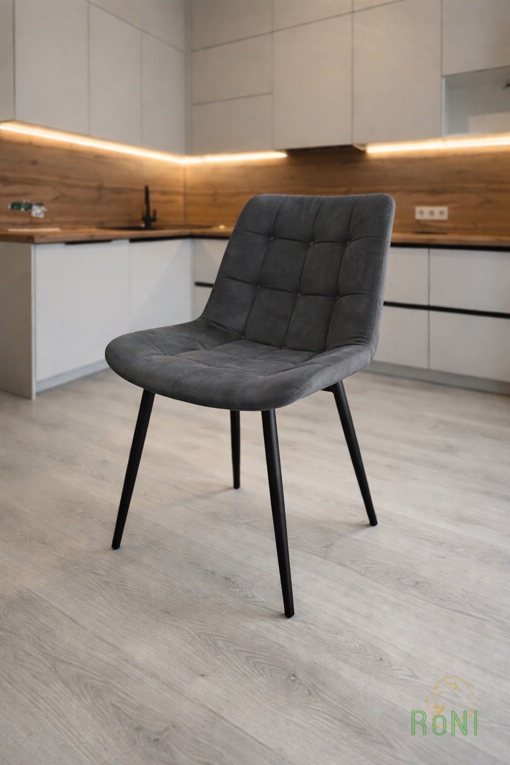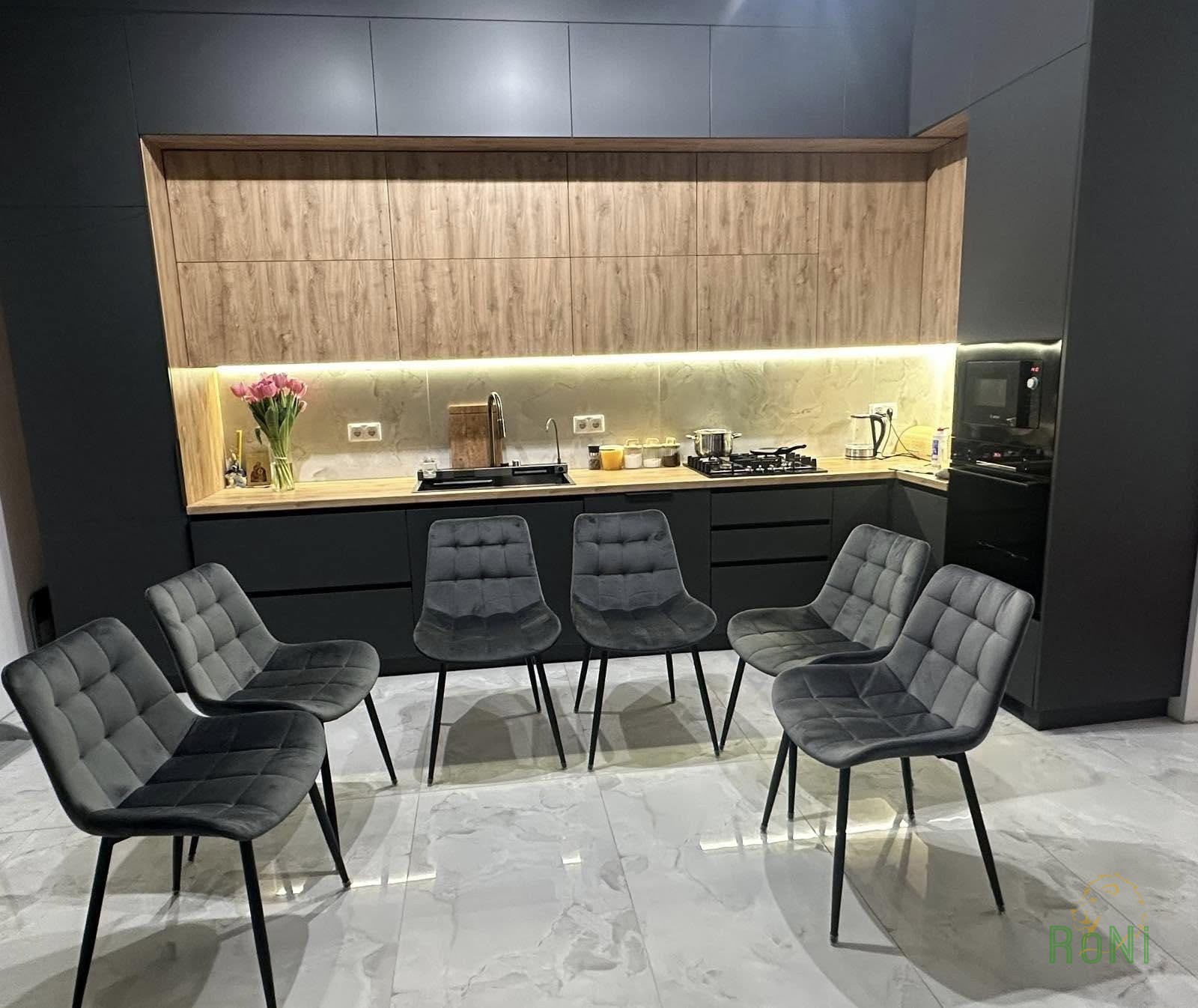 Кресло RoNi Star является простой конструкцией с закругленными краями – это вариант без подлокотников. Контурный корпус обтянут тканью велюр элегантного цвета. Модель отличается декоративной строчкой и прострочкой, которые не только подчеркивают эстетический характер мебели, но и создают впечатление великолепия и мягкости наполнения, что, безусловно, повышает удобство использования. Стул поставлен на стойкое основание, состоящее из четырех металлических ножек черного цвета. Каждая ножка дополнительно оснащена заглушками, благодаря которым пол сохранит первоначальное состояние, невзирая на ежедневное использование стульев.